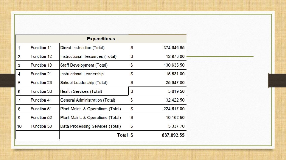 Title I: (65%) Campus Eligibility School’s free-reduced ratio is the criteria An LEA may designate as eligible: any campus with at least 35 percent poverty as ‘targeted assistance’. any campus with at least 40 percent poverty as ‘school-wide program’. Title I revenue: 338 * 262. 50 = $ 88, 725 Title II: No 35%-40% poverty requirement Title II revenue: 520 * 0. 87= $ 452. 4 IDEA-B, Special Education Fund Allocated based on population (65%) and poverty (15%) per prior year PEIMS data. Texas Education Agency provides $87 per qualified ( Free and Reduced) Student for IDEA-B grant # of Free & Reduced Students: 338 * 0. 87= 294. 06 IDEA B Revenue: 41*7, 125 = $292, 125 Federal Funds Title III IDEA-B)