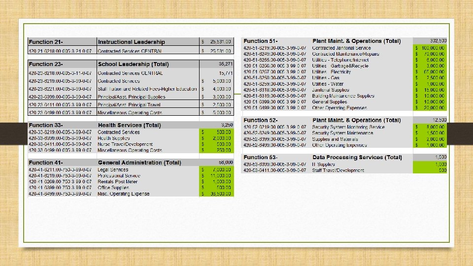 Position Payroll Total Principal Propose 1 Salaries Total $ 100, 000. 00 Assistant Principal 1 $ 75, 000. 00 Teachers 45 $ 48, 000. 00 $ 2, 160, 000. 00 Counselor 1 $ 50, 000. 00 Librarian 1 $ 48, 000. 00 Social Worker 1 $ 40, 000. 00 Secretary 1 $ 35, 000. 00 Nurse 1 $ 48, 000. 00 Diagnostician 1 $ 50, 000. 00 Attendance Clerk 1 $ 28, 000. 00 Custodians 4 $ 40, 000. 00 $ 160, 000. 00 Teacher Aids 7 $ 25, 000. 00 $ 175, 000. 00 Grant Total: $ 2, 969, 000. 00