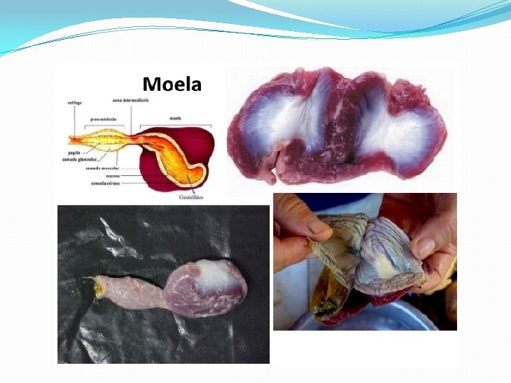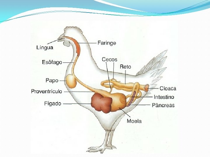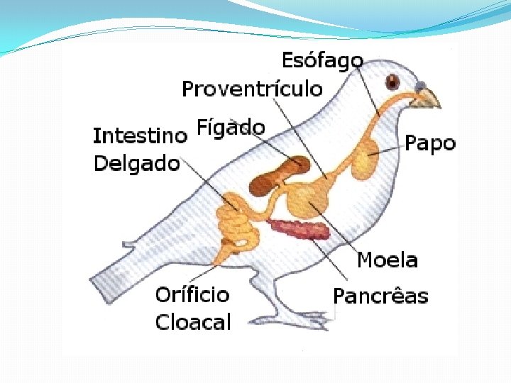 Nutrição § A produção de enzimas digestivas ocorre no estômago químico ou proventrículo. § Nas aves que se alimentam de grã-os, a ausência de dentes é compen-sada pela existência, em muitas aves, de um estômago chamado moela ou estômago mecânico, que tritura o alimento. § Em muitas aves, existe uma dilata-ção no esôfago (papo), na qual o alimento é armazenado e amolecido. As