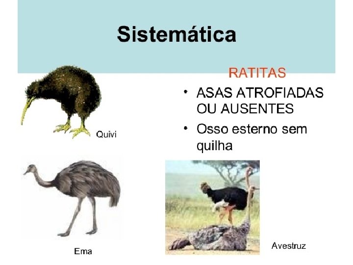 1 Morfologia e Fisiologia características das aves • Muitas estão, de alguma forma, relacionadas ao voo: o corpo aerodinâmico coberto de penas e os membros anteriores transformados em asas. • No entanto, nem todas as aves voam, no pinguim, as asas em forma de remo são usados para natação; na ema e no avestruz elas estão atrofiados, e os membros posteriores estão adaptados à corrida.