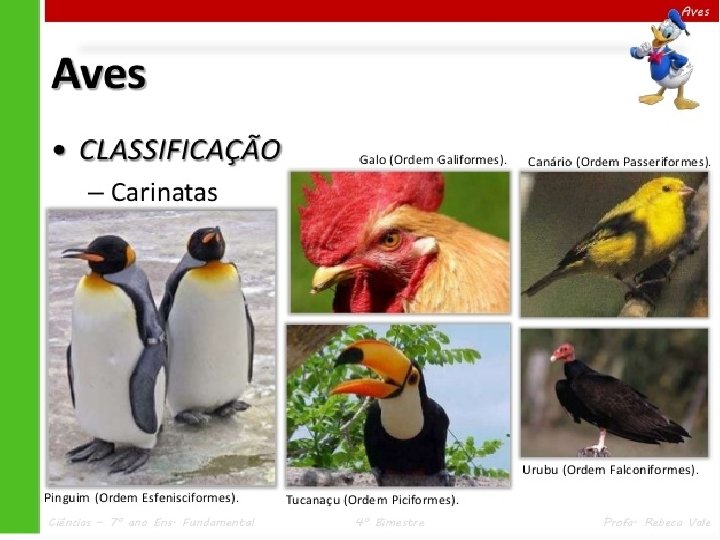 As aves são classificadas em grupos, tais como: • • • Ciconiforme: garça, flamingo, socó. Esfeniciforme: é o pingüim. Columbiforme: representada pelo pombo. Reiforme: representada pela ema da América do Sul. Psitaciforme: papagaio, arara, periquito, maritaca. Passeriforme: sabiá, andorinha, gralha, joão-de-barro, bemte-vi, pardal, canário, corruíra. Estrucioniforme: representada pelo avestruz que vive na África. Estrigiforme: é a coruja Tinamiforme: codorna, perdiz, inambu. Galiforme: galinha, mutum, jacu, uru. Falconiforme: falcão, águia, gavião. Piciforme: tucano, pica-pau.