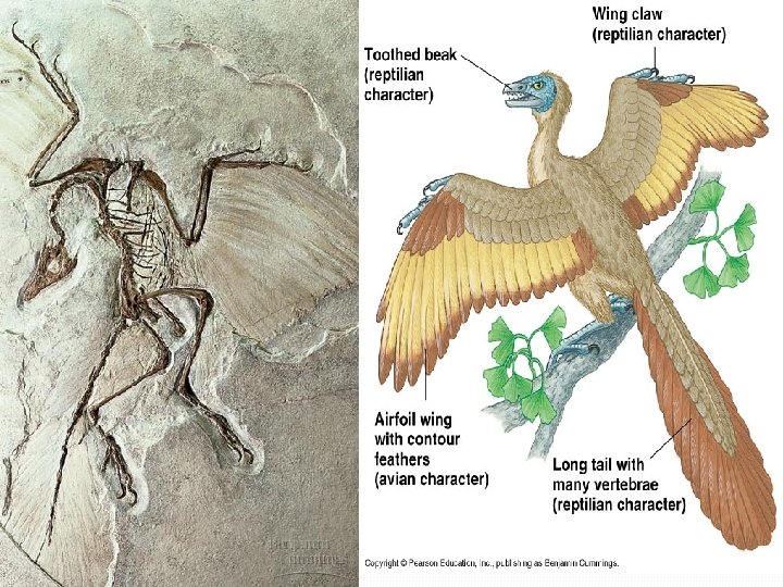 § Outro fóssil descoberto na Alemanha, com 150 milhões de anos, apresentava penas, mas ainda possuía dentes e uma longa cauda óssea. (Archaeopteryx)