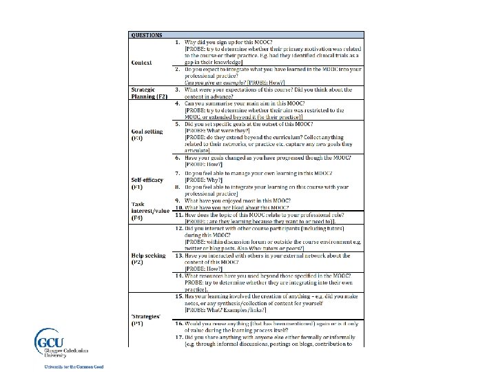 Instrument: Semi-Structured Interview • Explored various aspects of MOOC learning, structured around SRL sub-processes including self-efficacy, goalsetting and learning and task strategies, as well as patterns of help-seeking, self-reflection etc. • Available from figshare (IDS version): https: //figshare. com/articles/Interview_Script_SRL_in_MOOCs_IDS_/1300050