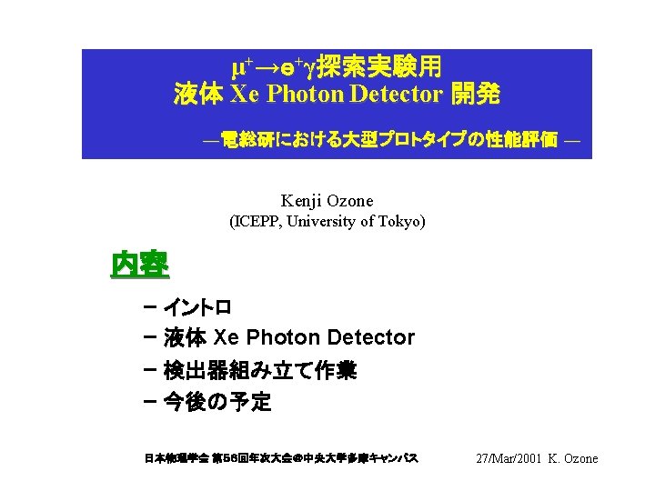 GEANT 3 によるM. C. simulation • Signal is distributed over many PMTs in most cases • Weighted mean of PMTs on the front face dx ~ 4 mm FWHM • Broadness of distribution dz ~ 16 mm FWHM • Timing resolution dt ~ 100 ps FWHM • Energy resolution ~ 1. 4% FWHM depends on light attenuation in LXe 日本物理学会 第56回年次大会@中央大学多摩キャンパス 27/Mar/2001 K. Ozone