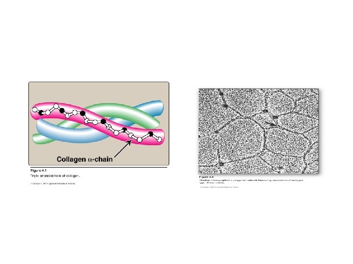Types of collagen • Collagen super family of proteins includes more than 20 collagen types • The three polypeptide a chains are held together by hydrogen bonds between chains • a chains are ~1000 amino acids long but with slightly different properties • These a chains are combined to form the various types of collagen found in tissues. Examples: Type 1 collagen: collagen Most common collagen contains two a 1 chains and one a 2 chain a 12 a 2 Type II collagen: collagen contains three a 13