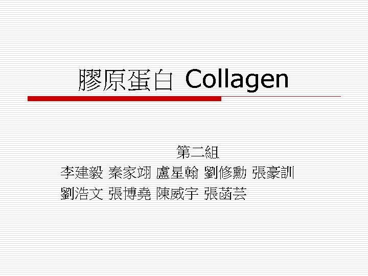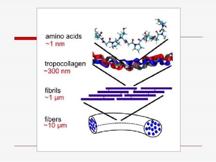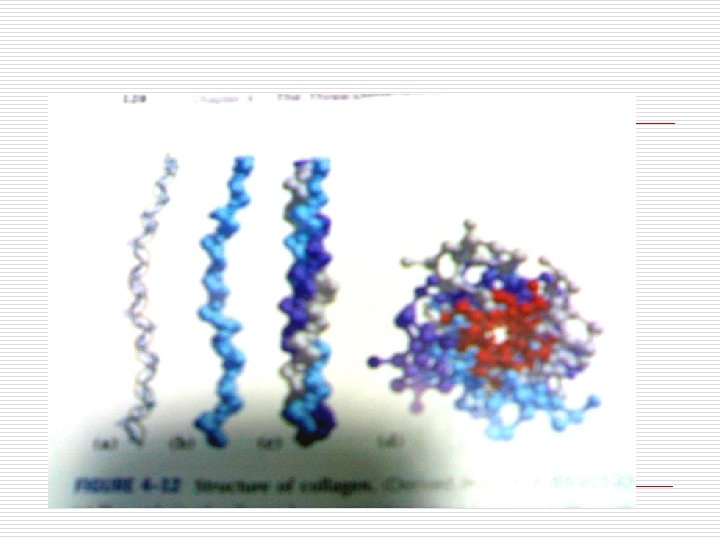 Collagen Structure: Primary sequence : Gly-X-Pro(Hy. Pro) Monomer( alpha chain)=> left handed helix, 3 a. a. per turn Trimer: coiled-coil => stabilized by H-bond crosslink between triple helixes(disulfide bond) Tendons, cartilage, cornea, skin, bone Function: Provide tensile strength