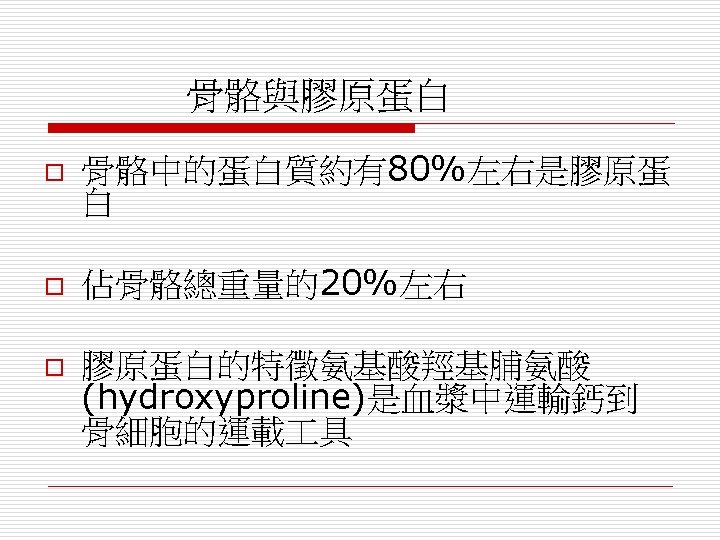 Scurvy(壞血病) symotioms oblood vessels ruptured and blood wept from hair follicles. o. Blotches appeared all over the body obruise or exertion could result in internal bleeding. o. Arms and legs would swell up owounds, even small scratches, would not heal. o. Gums reddened, receded, and blackened until teeth loosened and fell out 病因 o. The role that Vit. C plays in the formation of ligand. o. A collagen is constructed by many tripeptides. Gly-X-Y o. And the most stable form is Gly-Pro-4 -Hyp.
