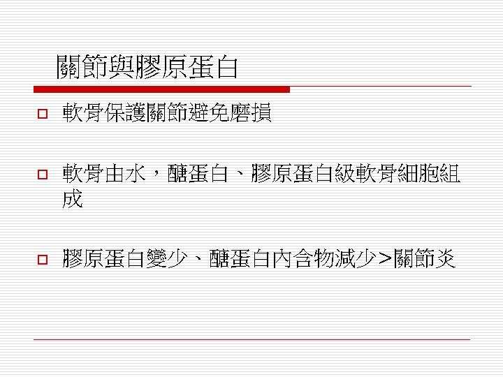 Covalent Cross-Links 共價連接 Tropocollagen結合成collagen之微纖維 (microfibril) ,最初是藉鏈內的氫鍵在穩定, 後來則靠螺旋內和螺旋間形成的共價鍵來穩 定。 Lysine lysyl oxidase Hydroxylysine aldehyde 上的ε胺基 醛纇