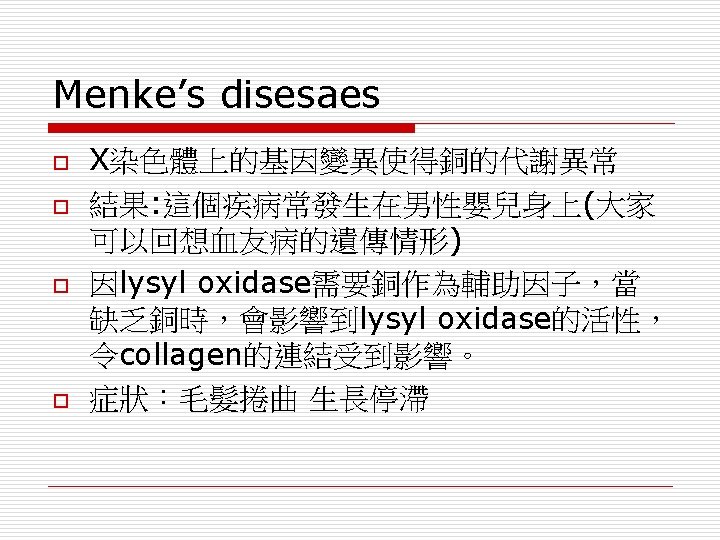 Causes o o A variety of genetic alterations (mutations) 遺傳方式:顯性遺傳、隱性遺傳、性聯遺傳 突變的基因無法正常合成下列蛋白質: Proteins that are used to assemble different types of collagen. Proteins that process or interact with collagen.
