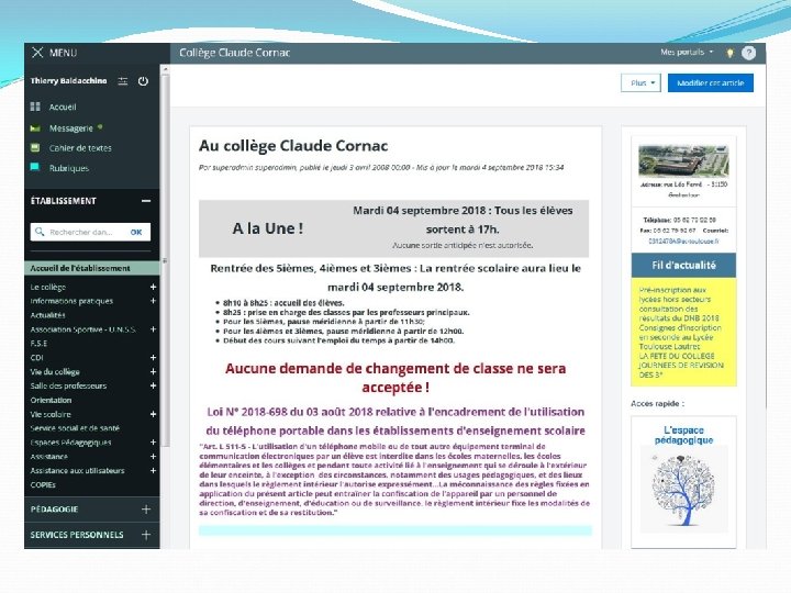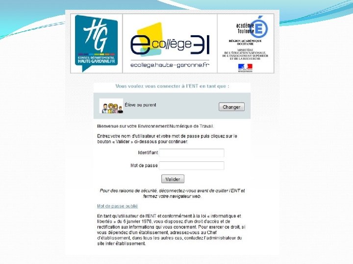 L’ENT ecollège • http: //claude-cornac. ecollege. haute-garonne. fr/ • Informations concernant la vie au collège : menus du service de restauration, dates des conseils de classe, documents administratifs, manifestations ponctuelles… • Accès au cahier de textes, notes