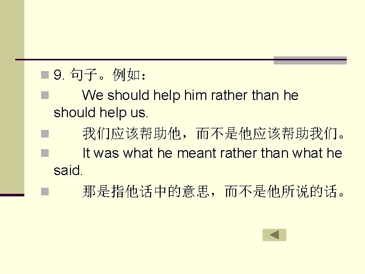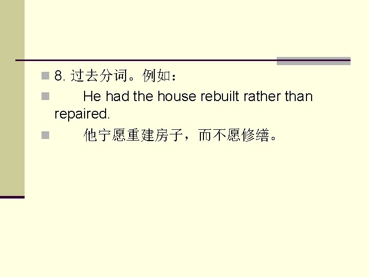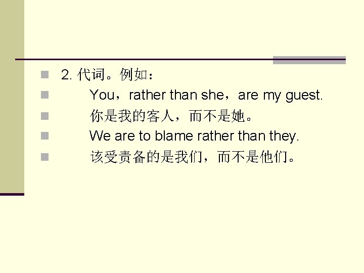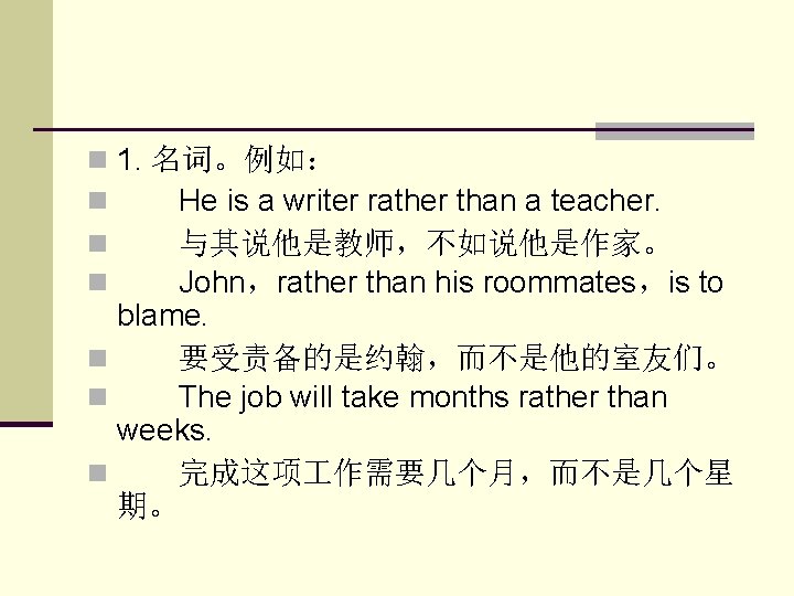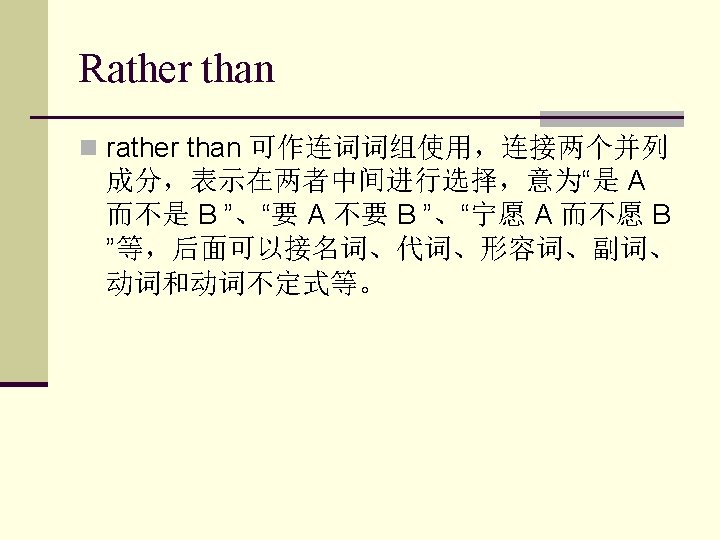 5. 动词。例如: She left rather than stayed at home. 她不是呆在家里,而是走了。 Rather than cause trouble,he went away. n 他宁可走开而不愿惹麻烦。 n Rather than have the radio repaired, he’d like to buy a new one. n 与其修理那部收音机,他想还不如买一 部新的。 n n