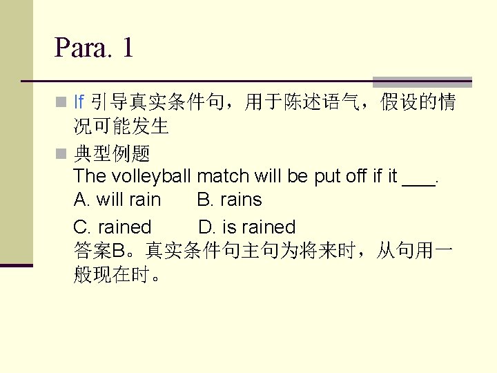 n n n unless: 除非,如果不,相当于“if not”,本身表示否 定,引导条件状语从句。 例: My baby sister doesn’t cry unless she’s hungry. =My baby sister doesn’t cry if she isn’t hungry. nless you take more care, you’ll have an accident. 如果你不多加小心的话,你会出事的。 Exceptional talent does not always win its reward unless favored by exceptional circumstance. 除非得 到特殊的情况的护佑,否则有特殊才能的人并不总能 赢得对其才能的回报。 例题:_______ changed, this law will make life difficult for farmers. A. Until B. In case C. Unless D. So that