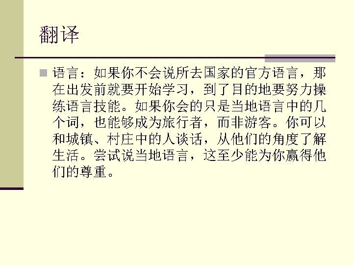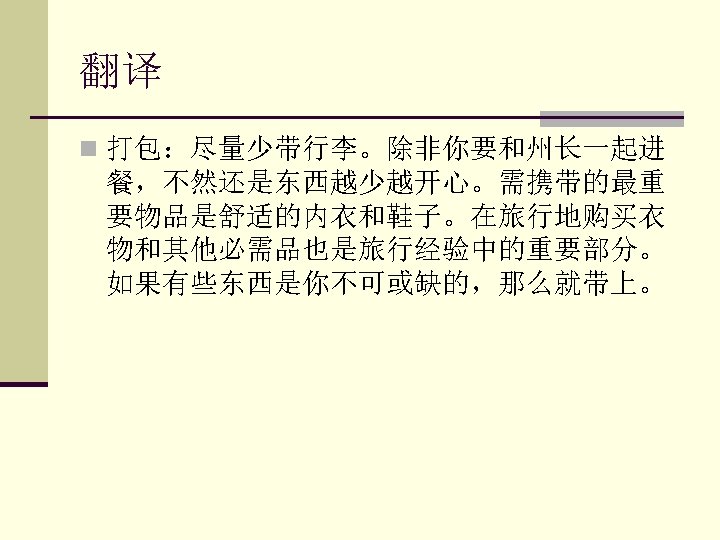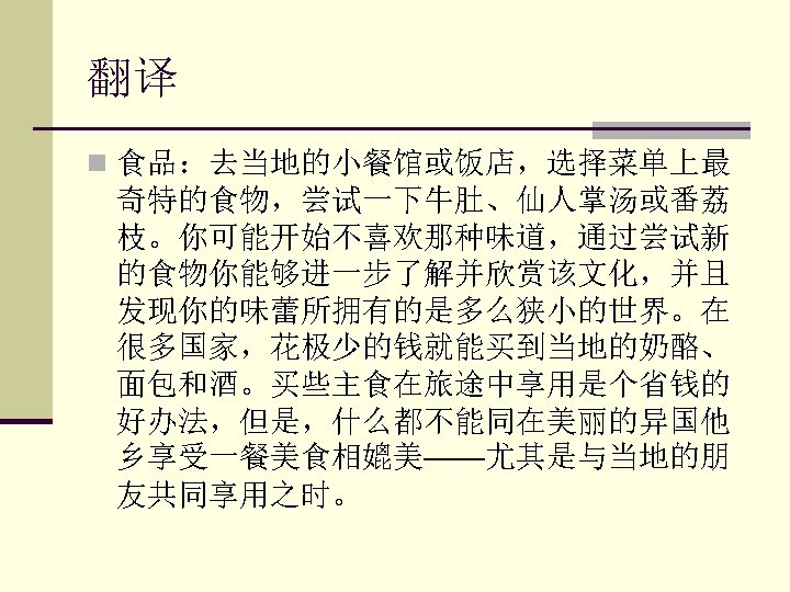 n 3. If there are certain things you cannot live n n n without, take them with you. 如果有些东西是你不可或缺的,那么就带上。 4. By trying new foods you gain a better understanding and appreciation of the culture. 通过尝试新的食物你能够进一步了解并欣赏 该文化。 5. Buying a few staple foods and eating as you travel is a good way to save money. 购买一些主食在旅途中食用是一个省钱的好 办法。