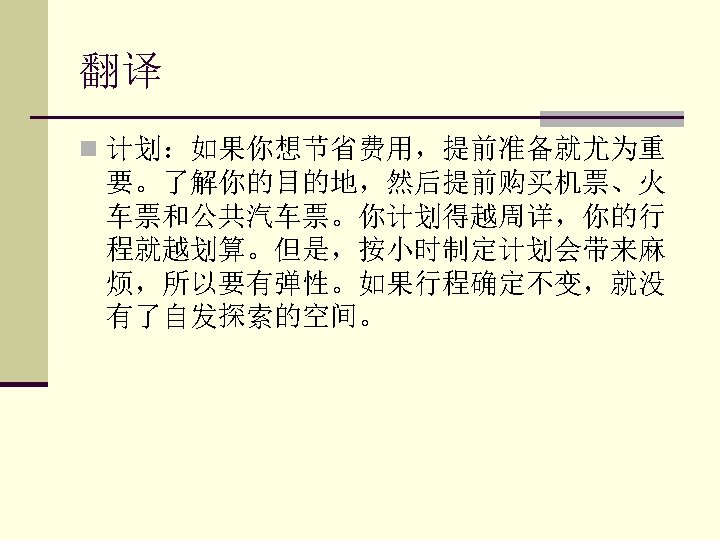 V. Translation n 1. You can talk to people in towns and villages and learn about life from their perspective. n 你可以和城镇、村庄中的人谈话,从他们的 角度了解生活。 n 2. However, scheduling every hour of your time invites disaster. n 但是,为每个小时制定计划会带来麻烦。