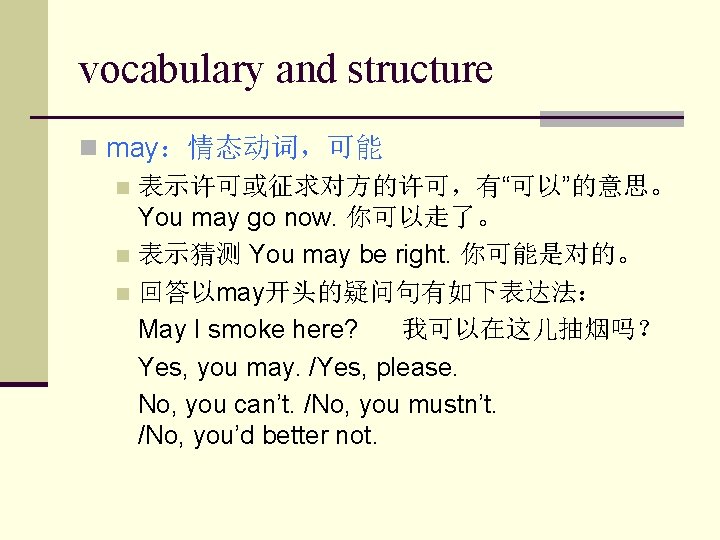vocabulary and structure n make sure 确定,确认 例句: n An optimist stays up until midnight to see the new year in. a pessimist stays up to make sure the old year leaves. 乐观者呆至半夜以迎 新年,悲观者呆至半夜以别旧岁。 n fill out 填写 n I had to fill out a form before getting my license. 我在取得执照前必须先填写表格。