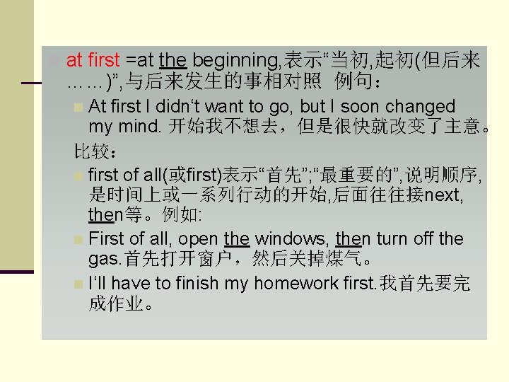 vocabulary and structure n Cultural Immersion 文化渗透,文化洗礼 n immersion: n. 浸泡,浸入,沉溺 e. g. immersion in study 埋头研究 immersion in thought 沉思 n immerse:v. 浸入,浸泡 ,沉迷于 get immersed in 沉浸于 immerse one's head in the water将头浸入水中 scholars who immerse themselves in their subjects 埋头于课题的学者 The whole town was immersed in a festival atmosphere. 全镇沉浸在节日的气氛中。