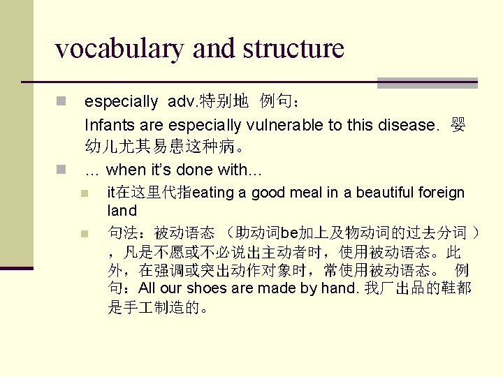 vocabulary and structure n particularly:adv. 特别地 n The lecture aims particularly at young students. 讲座尤其针对年轻学生。 n particular: adj. 特别的,特殊的;值得注意的 n n n in this particular case 在这种特殊情况下. for no particular reason 没有特殊理由. He took particular trouble to get it right. 他费 了好大的劲才把它弄好.
