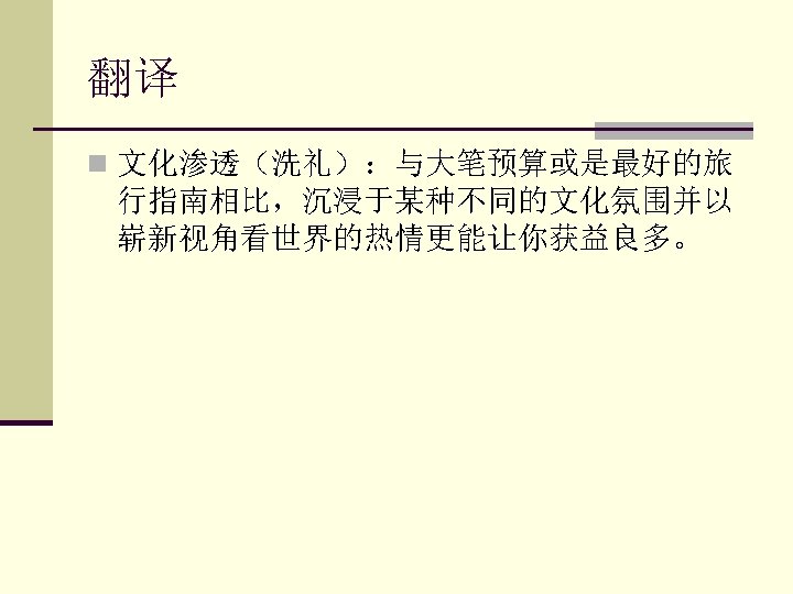 n A passion about immersing yourself in a different n n n culture and seeing the world from a new point of view will take you further than a huge budget or the best guidebook. 长句子基本结构:主语A passion about… +谓语will take+宾语you passion:激情 immerse oneself in… 让自己沉浸于 point of view:观点 see the world from ~从全新的观 点看世界 take you further than… 带给你的比……更多