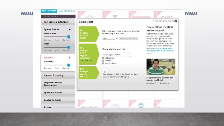 STARTING THE COLLEGE SEARCH v Academics v Campus Visit v Location v Application Process v Student Population v Cost of Attendance v Scholarships/WUE v Student to Faculty Ratio v Student Life v Opportunities