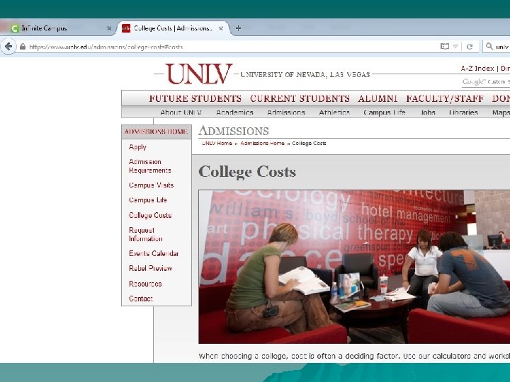 COST OF ATTENDANCE (COA) UNLV (approx. annual) Tuition $7, 267 (15 cr. /sem) Fees $1, 196 Books (approx. ) $1, 000 COA/year ** $9, 463 **Does not include transportation & personal expenses UNR (approx. annual) Tuition $ 6, 990 (15 cr. /sem) Fees 1, 044 Books (approx) 1, 000 Room/Board 10, 000 COA/year ** $19, 034