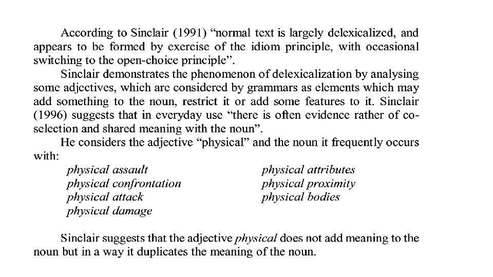 • Semantic preference represents an attraction between a word and one or more semantic fields. Another example from the language of tourism is provided by the frequent pattern guests are welcome to which strongly attracts a group of verbs belonging to the semantic field of tourism activities (as in guests are welcome to stroll around the farm/to join the farm activities). • E. g. operation…, review…, cast…, palette # • Semantic prosody represents a further step into abstraction and it is used to describe the attraction between a word and a positive, negative or neutral evaluation of that word and its collocates. Sinclair provides the example of happen which usually gives the unit a negative connotation and Stubbs (2002) makes the example of cause which occurs with words for unpleasant events. Its main collocates are problems, death, damage, concern, trouble, cancer, disease. These attractions explain why a word cannot be considered the basic unit of language. • E. g. accident, excitement # Words combine with other words, grammatical categories, and semantic fields and create what Sinclair (1996) calls “extended units of meaning”. He says that the tendencies of words to co-occur with other words (collocation), with word classes (colligation), with set of meanings (semantic preference), and attitudes (semantic prosody) are so strong that we must expect the units of meaning to be much more extensive and varied than just a single word.
