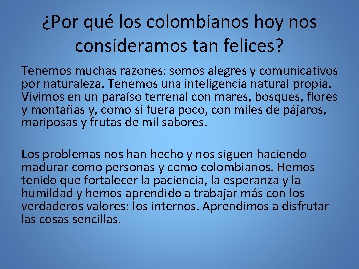 ¿Por qué los colombianos hoy nos consideramos tan felices? Tenemos muchas razones: somos alegres y comunicativos por naturaleza. Tenemos una inteligencia natural propia. Vivimos en un paraíso terrenal con mares, bosques, flores y montañas y, como si fuera poco, con miles de pájaros, mariposas y frutas de mil sabores. Los problemas nos han hecho y nos siguen haciendo madurar como personas y como colombianos. Hemos tenido que fortalecer la paciencia, la esperanza y la humildad y hemos aprendido a trabajar más con los verdaderos valores: los internos. Aprendimos a disfrutar las cosas sencillas.