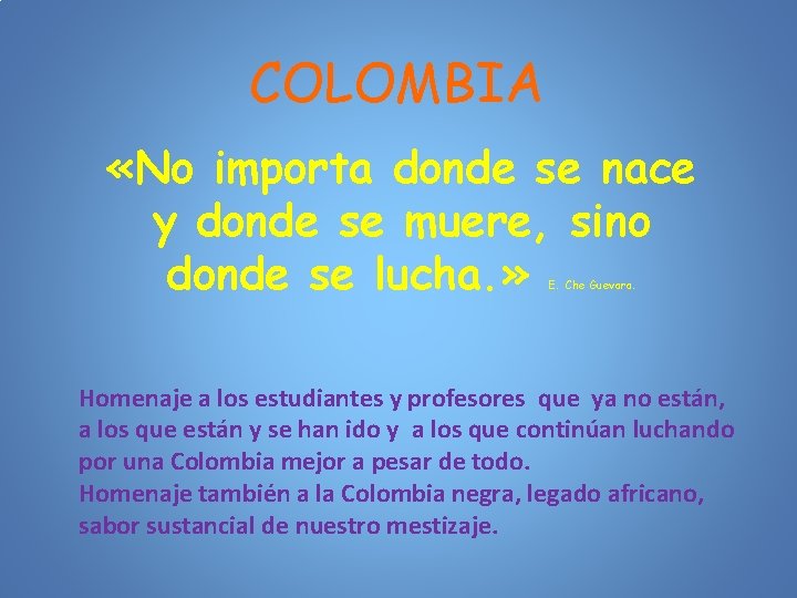 COLOMBIA «No importa donde se nace y donde se muere, sino donde se lucha. » E. Che Guevara. Homenaje a los estudiantes y profesores que ya no están, a los que están y se han ido y a los que continúan luchando por una Colombia mejor a pesar de todo. Homenaje también a la Colombia negra, legado africano, sabor sustancial de nuestro mestizaje.