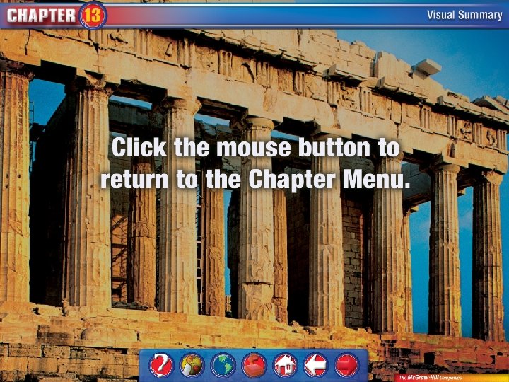 To use this Presentation Plus! product: Click the Forward button to go to the next slide. Click the Previous button to return to the previous slide. Click the Home button to return to the Chapter Menu. Click the Transparency button from the Chapter Menu, Chapter Introduction slides, or Visual Summary slides to access the transparencies that are relevant to this chapter. From within a section, click on this button to access the relevant Daily Focus Skills Transparency. Click the Return button in a feature to return to the main presentation. Click the History Online button to access online textbook features. Click the Reference Atlas button to access the Interactive Reference Atlas. Click the Exit button or press the Escape key [Esc] to end the slide show. Click the Help button to access this screen. Links to Presentation Plus! features such as Maps in Motion, Graphs in Motion, Charts in Motion, Concepts in Motion, and figures from your textbook are located at the bottom of relevant screens.