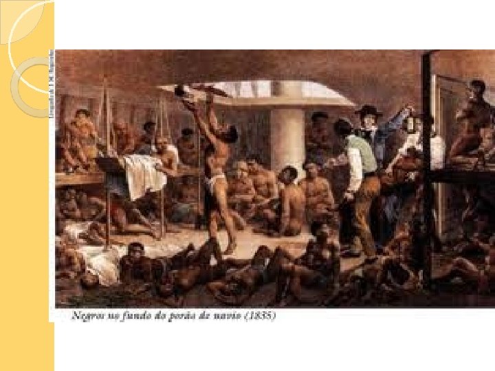 Navio negreiro: nos navios a alimentação era insuficiente para todos e havia superlotação. Muitos morriam no percurso da viagem, vitimados por maus-tratos e por várias doenças. Na colônia, os africanos eram vendidos em mercados. O preço dependia das características físicas e seu aparente estado de saúde.