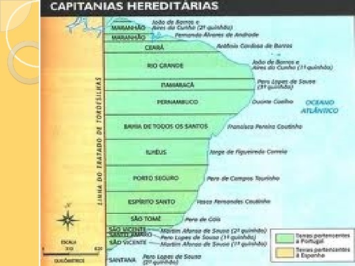 CAPITANIAS HEREDITÁRIAS Em 1534 o governo português dividiu as terras que lhe pertenciam pelo Tratado de Tordesilhas em quinze faixas de terra – CAPITANIAS HEREDITÁRIAS.