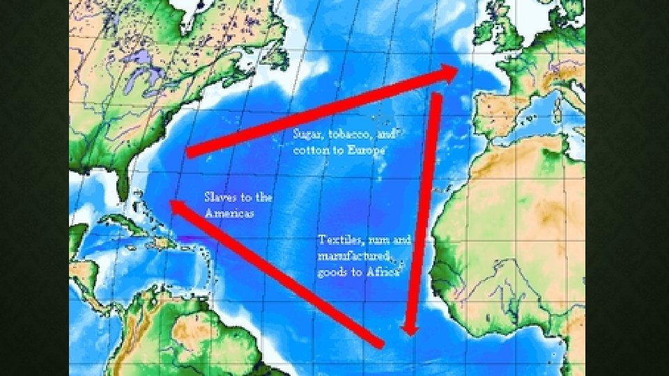 TRIANGLE TRADE MAP 1. With a partner, create a map of the Triangle Trade ON TOP of the Columbian exchange map that you just did! Your map must include: - Both the New World and the Old World - Three Arrows signifying the trade of items between the continents (Hence TRIANGLE TRADE) - Full lists of items traded - Different colors than you used before