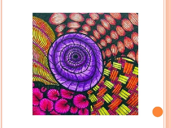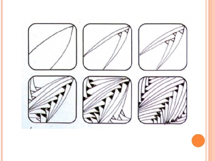 ZENTANGLE HOW TO Fill Your Zentangle o Begin to fill the shapes made by your string. o While doing this you s can listen to some music. o These simple patterns you are creating are called 'tangles'.
