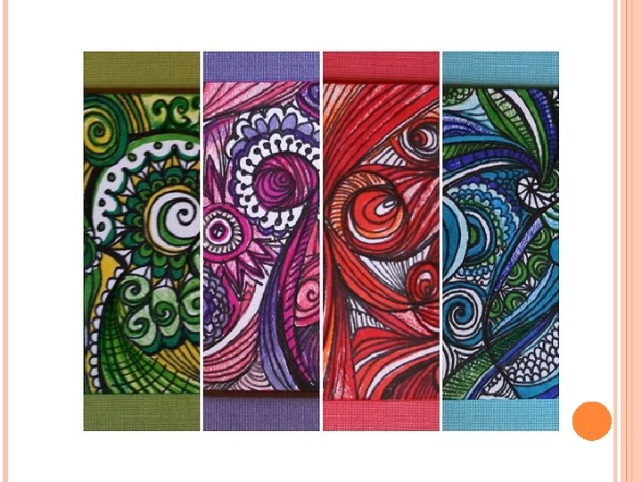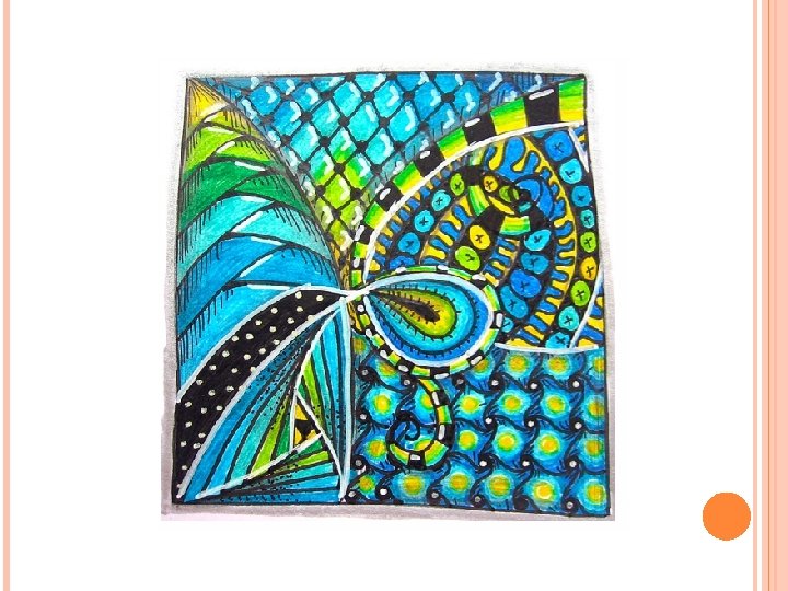 ZENTANGLE COLORS What is a Zentangle? o o o Miniature pieces of unplanned, abstract art created in a very structured method from a series of repetitive patterns on a square paper tile. The process is a form of “artistic meditation” as one becomes completely engrossed in making each pattern, deliberately focusing on “one stroke at a time”. The creativity options and pattern combinations are boundless. And anyone can do it successfully!