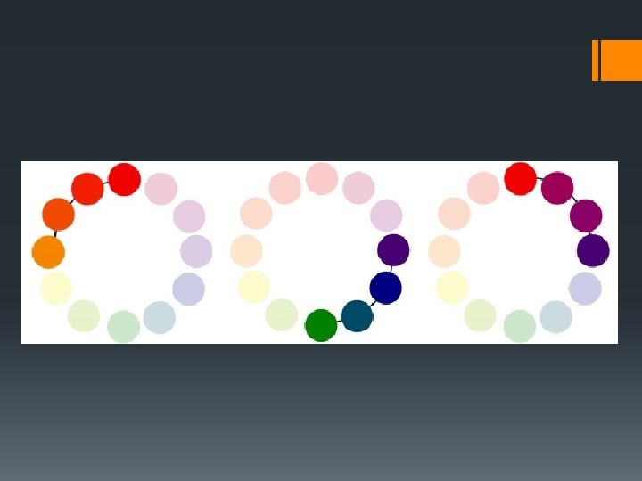 Análogos § El sistema de colores análogos envuelve de tres a cinco colores adyacentes en la rueda de colores estudiada. Esta combinación envuelve poco contraste. § Este sistema de colores es muy elegante y se puede observar en la naturaleza, por ejemplo en las llamaradas del fuego o en los azules del océano.