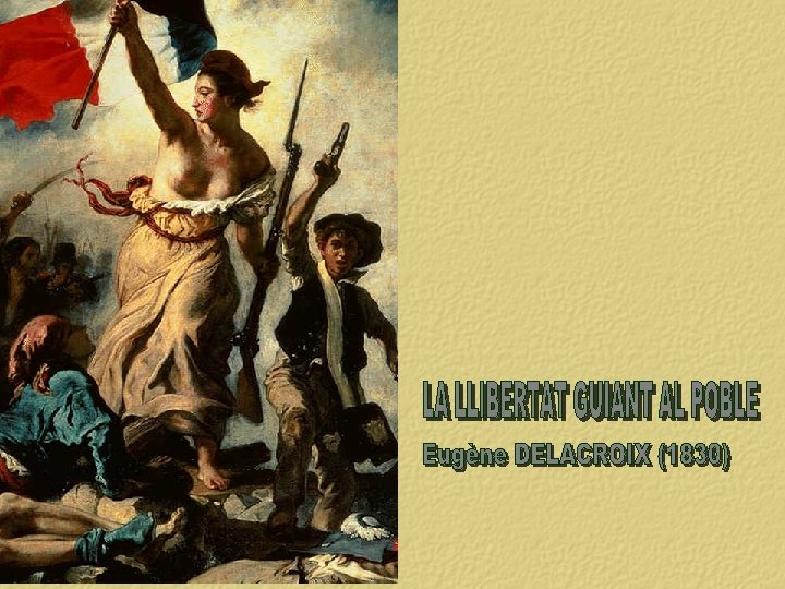 FITXA TÈCNICA (CATALOGACIÓ) 1. - FITXA TÈCNICA (CATALOGACIÓ) - Nom de l’obra La Llibertat guiant al poble - Autor Eugène DELACROIX - Estil Romanticisme - Cronologia Primer terç del segle XIX (1830) - Tècnica i suport - Localització - Dimensions Oli sobre tela Museu del Louvre (Paris) Gran format. (2, 60 x 3, 25 m. )