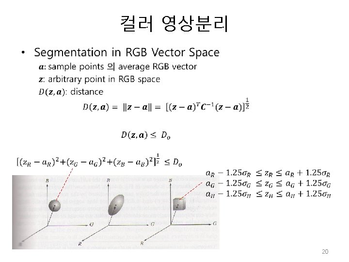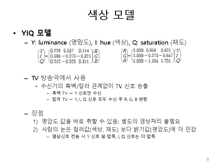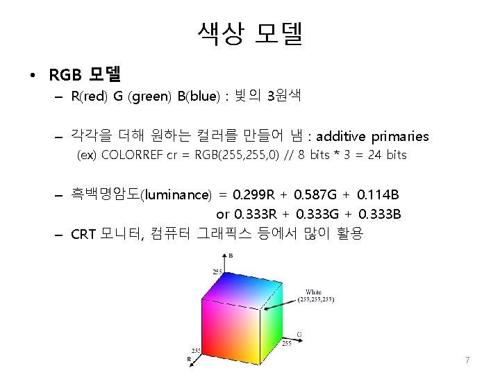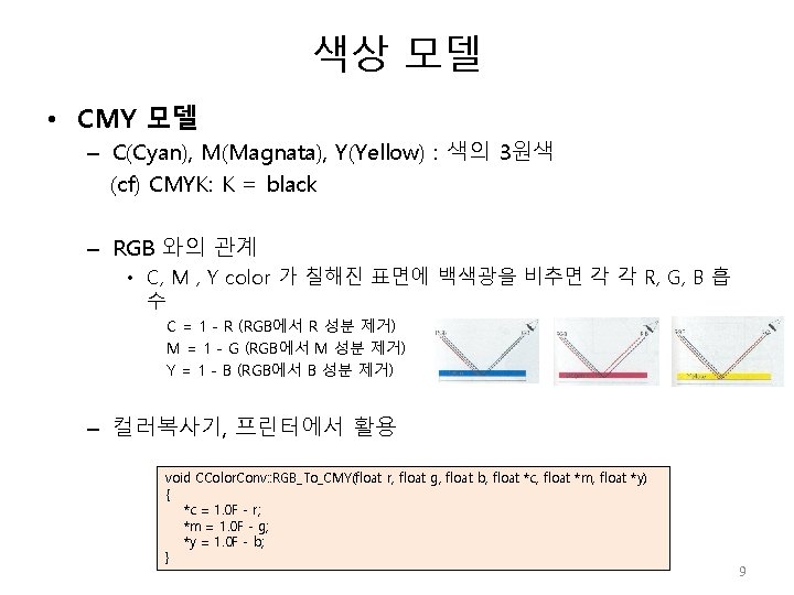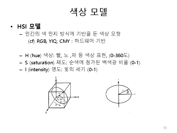 색상 모델 void CColor. Conv: : RGB_To_HSI(float r, float g, float b, float *h, float *s, float *i) { float minc; // minimum and maximum RGB values float angle; // temp variable used to compute Hue // r, g, b = 0~1 사이값 minc = MIN(r, g); minc = MIN(minc, b); // 밝기값(Intensity) 의 계산: 밝기값은 r, g, b, 의 평균을 취함 �*i=(r + g + b) / 3. 0 f; // 색상(Hue)과 채도(staturation)값의 계산 �if((r==g) && (g==b)) /// gray-scale { *s = 0. 0 f; // 채도 *h = 0. 0 f; // 색상 return; } else { � *s= 1. 0 f - (3. 0 f / (r + g + b)) * minc; � angle = (r - 0. 5 f * g - 0. 5 f * b) / (float)sqrt((r - g) * (r - g)+(r - b) * (g - b)); // 기하변환 적용 *h = (float)acos(angle); *h *= 57. 29577951 f; /// 각도값으로 전환 (180 o/phi) } if(b>g) *h = 360. 0 f - *h; } 15