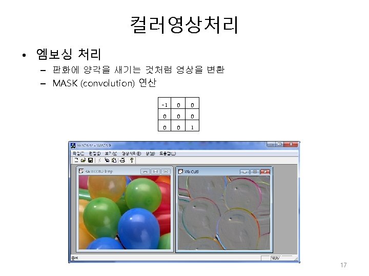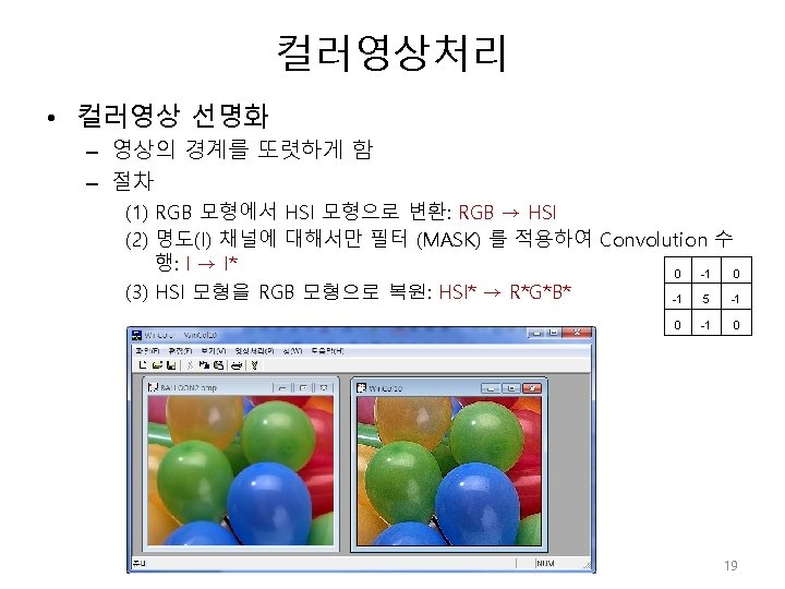 컬러영상처리 void CWin. Color. Doc: : m_Color. Embossing(unsigned char *In. Img, unsigned char *Out. Img, int height, int width) { int rwsize = WIDTHBYTES(24*width); // convolution MASK int i, j, k, l, index 1, index 2, index 3, winsize=3; float *Mask =new float [winsize*winsize]; for(i=0; i<winsize*winsize; i++) Mask[i]=0. 0 f; Mask[0]=-1. 0 f; Mask[8]=1. 0 f; int n=(winsize-1)>>1; // winsize offset for(i=n; i<height-n; i++) { index 1 =i*rwsize; for(j=n; j<width-n; j++) { float sum 1=0. 0 f; float sum 2=0. 0 f; float sum 3=0. 0 f; for(k=-n; k<=n; k++) { index 2 = (i+k)*rwsize; index 3 = (k+n)*winsize; for(l=-n; l<=n; l++) { sum 1 +=In. Img[index 2+3*(j+l) ]*Mask[index 3+l+n]; //R sum 2 +=In. Img[index 2+3*(j+l)+1]*Mask[index 3+l+n]; //G sum 3 +=In. Img[index 2+3*(j+l)+2]*Mask[index 3+l+n]; //B } } sum 1 += 128; sum 2 += 128; sum 3 += 128; CLIP(sum 1, 0, 255); CLIP(sum 2, 0, 255); CLIP(sum 3, 0, 255); Out. Img[index 1+3*j ] = (unsigned char)sum 1; Out. Img[index 1+3*j+1] = (unsigned char)sum 2; Out. Img[index 1+3*j+2] = (unsigned char)sum 3; } } delete []Mask; } 18