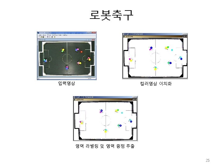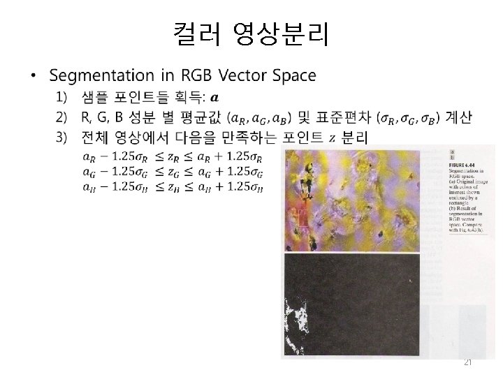 컬러 영상분리 • Segmentation in HSI Color Space 문제: 원 영상에서 붉은색 영역 추출 H(hue) image * binary S(saturation) mask 22
