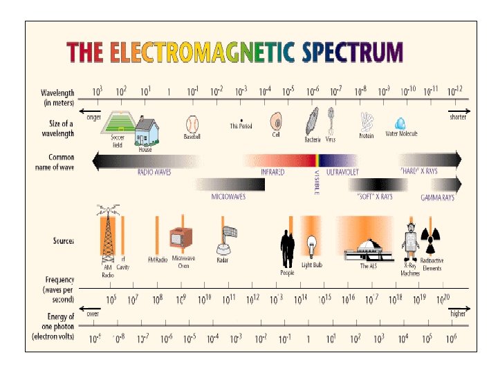 Radiant Energy • Visible light is a small segment of all the radiant energy given off by the Sun. – Examples: x-rays, gamma rays, ultraviolet rays, microwaves, and radio waves • Radiant energy is measured on the basis of the wavelengths and placed on an electromagnetic spectrum.