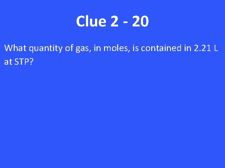 Clue 2 - 20 What quantity of gas, in moles, is contained in 2. 21 L at STP?
