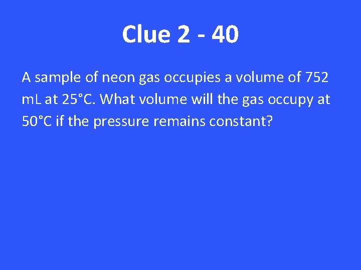 Clue 2 - 40 A sample of neon gas occupies a volume of 752 m. L at 25°C. What volume will the gas occupy at 50°C if the pressure remains constant?