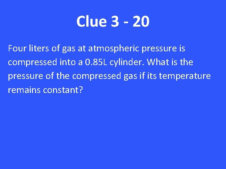 Clue 3 - 20 Four liters of gas at atmospheric pressure is compressed into a 0. 85 L cylinder. What is the pressure of the compressed gas if its temperature remains constant?