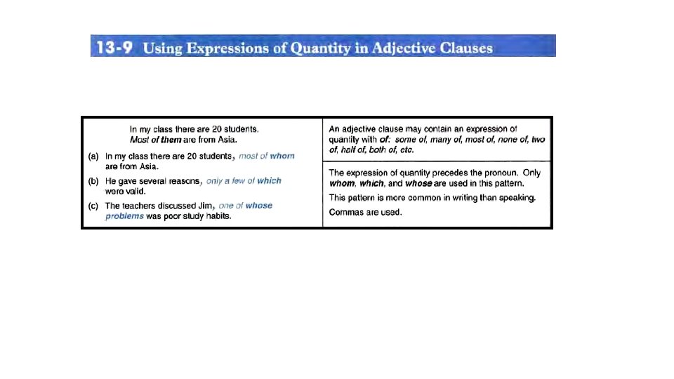 • Change the adjective clauses to adjective phrases. Cross out the adjective clause and write the adjective phrase above it. • wearing a green hat • 1. Do you see that man who is wearing a green hat? • 2. The person who is in charge of this department is out to lunch. • 3. The picture which was painted by Picasso is extremely valuable. • 4. The professors who are doing research will not teach classes next year. • 5. The students’ research projects which are in progress must be finished by the end of the year. • 6. The students’ research projects which are scheduled to begin in September will have to be completed by the middle of next year.