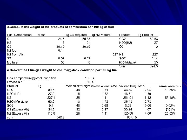 Example 3 Fuel ultimate analysis – Coal, as-fired: C 77%, H 2 5%, O 2 6%, S 1%, Ash 11% – Refuse: Ash 80%, Combustible 20% Flue gas analysis (by volume, dry basis) – CO 2 11. 90%, CO 0. 36%, O 2 7. 13%, N 2 80. 61% Determine the various product, the A: F ratio, and the excess air.