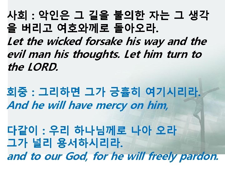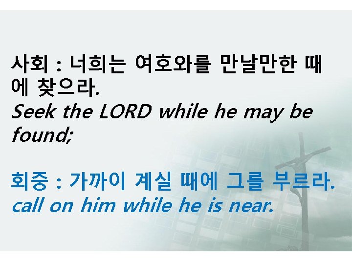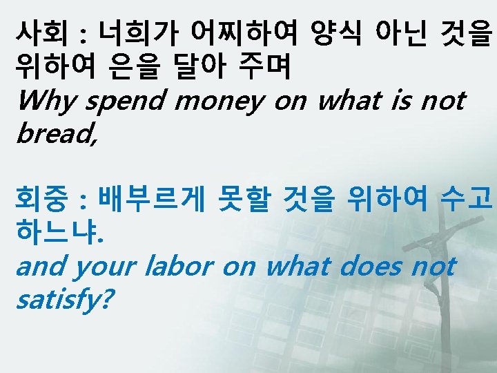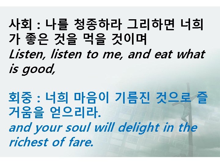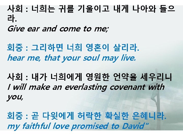 Come all you who are thirsty come to Slides: 7 Download presentation 사회 : 너희 목마른 자들아 물로 나아오 라 돈 없는 자도 오라. "Come, all you who are thirsty, come to the waters; and you who have no money, 회중 : 너희는 와서 사먹되 돈 없이 값 없이 와서 포도주와 젖을 사라. come, buy and eat! Come, buy wine and milk. without money and without cost.