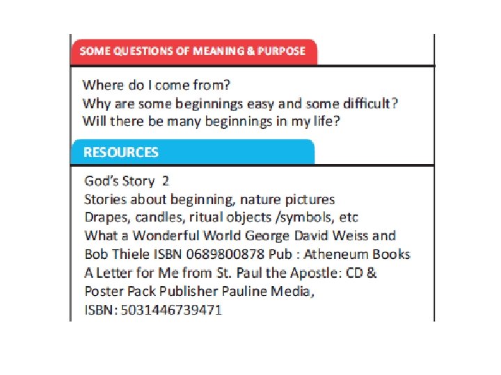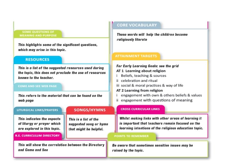 The Catechism of the Catholic Church addresses: • the human search for meaning, • God’s initiative in Revelation who comes to meet us and • our response of faith. (cf. CCC 26) This pattern guides the structure of the programme and informs the process of each topic, opened up through; Explore, Reveal and Respond.