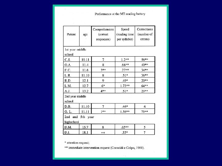 ragazzi con dislessia N=47 soggetti di controllo media DS 61. 8 30. 8 28. 4 12. 0 19. 3 8. 3 7. 3 5. 7 8. 3 2. 0 rapidità (centesimi per sillaba) punti z (-2. 78) correttezza 33. 1 (numero di errori) punti z (-3. 39) comprensione (numero di errori) punti z 5. 7 (1. 28) Dati relativi ad un gruppo di 47 dislessici (41 M e 6 F) e quelli del campione normativo della batteria (Cornoldi e Colpo, 1981).