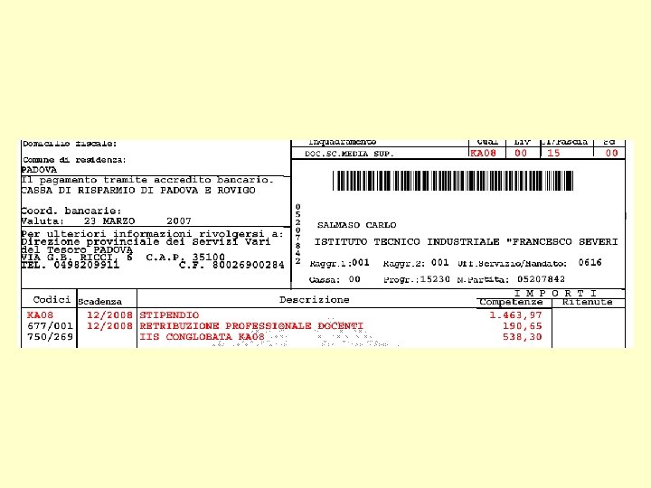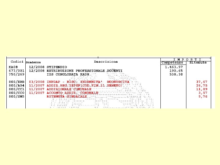 • In corrispondenza alla voce “Stipendio” viene riportato nella colonna delle Competenze l’ammontare mensile lordo dello stipendio spettante (come da tabelle contrattuali) in base alla Qualifica di appartenenza e all’anzianità di gradone maturata. • La ex Indennità Integrativa Speciale ( contingenza) è stata conglobata nello stipendio base ai soli fini del trattamento di fine servizio ( = Buonuscita) o fine rapporto ( = TFR), in applicazione dei CCNL del comparto Scuola e Ministeri. Pertanto la voce “indennità integrativa speciale” è stata sostituita con la voce “IIS conglobata KA 08 ” per il differente trattamento previdenziale. • Retribuzione Professionale Docenti (R. P. D. ) e Compenso Individuale Accessorio per il Personale ATA (C. I. A. ). Costituisce la parte di trattamento accessorio erogato direttamente dalla D. P. S. V. per dodici mensilità annue. • Assegni accessori sono la retribuzione accessoria corrisposta in via continuativa insieme con il trattamento fondamentale (esempio ore eccedenti prestate continuativamente per tutto l’anno. (