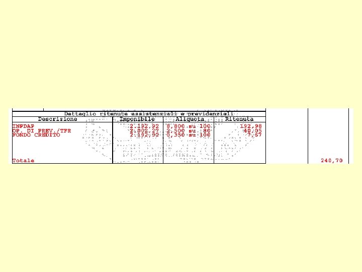 • Dettaglio ritenute assistenziali e previdenziali. • Vengono indicati in questa sezione gli importi che il datore di lavoro trattiene sulla busta paga del mese (ritenute a carico dipendente) e che verranno versati agli Enti previdenziali insieme agli oneri a carico del datore di lavoro. • L’imponibile su cui si calcola la ritenuta ai fini pensione (INPDAP)corrisponde al totale Competenze (2. 192, 92); in percentuale incide per l’ 8, 8%. • L’imponibile su cui si calcola la ritenuta ai fini Buonuscita/TFR è la somma delle voci Stipendio + I. I. S. Conglobata (1. 463, 97 + 538, 30 = 2. 002, 27); in percentuale il 2, 5 su 80 equivale al 2%. • L’imponibile su cui si calcola la ritenuta ai fini prestiti e mutui (FONDO CREDITO)corrisponde al totale Competenze (2. 192, 92); in percentuale incide per lo 0, 35%.