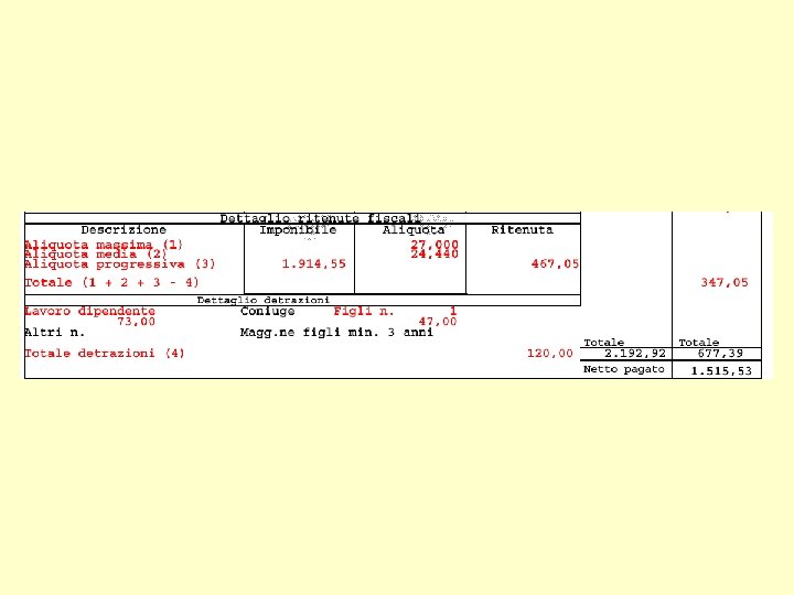 Nel nostro caso quindi avremo: • 1. 914, 55 € = imponibile • 1. 914, 55 – 1. 250 = 664, 55 € • 664, 55 x 27% = 179, 5 € • 287, 5 + 179, 5 = 467 € Totale ritenuta IRPEF